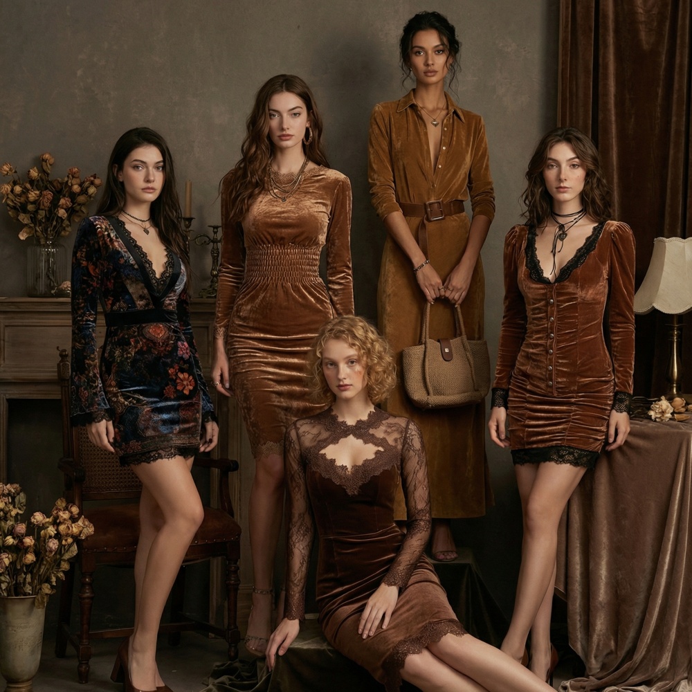 Women's Elegant Lace Trim Velvet Material Long Dress