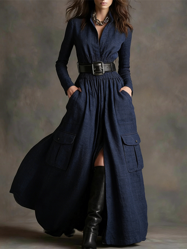 Vintage Zip Lapel Elastic Waist Maxi Dress