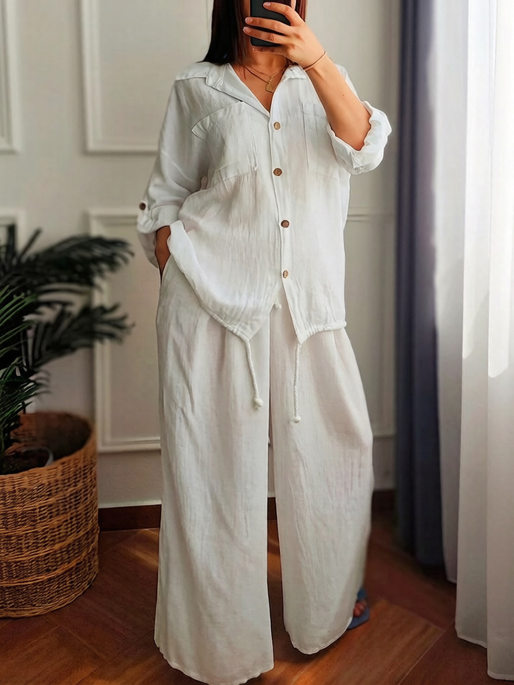 Casual Loose Linen Solid Color Shirt Wide-leg Pants Two-piece Set$65.99