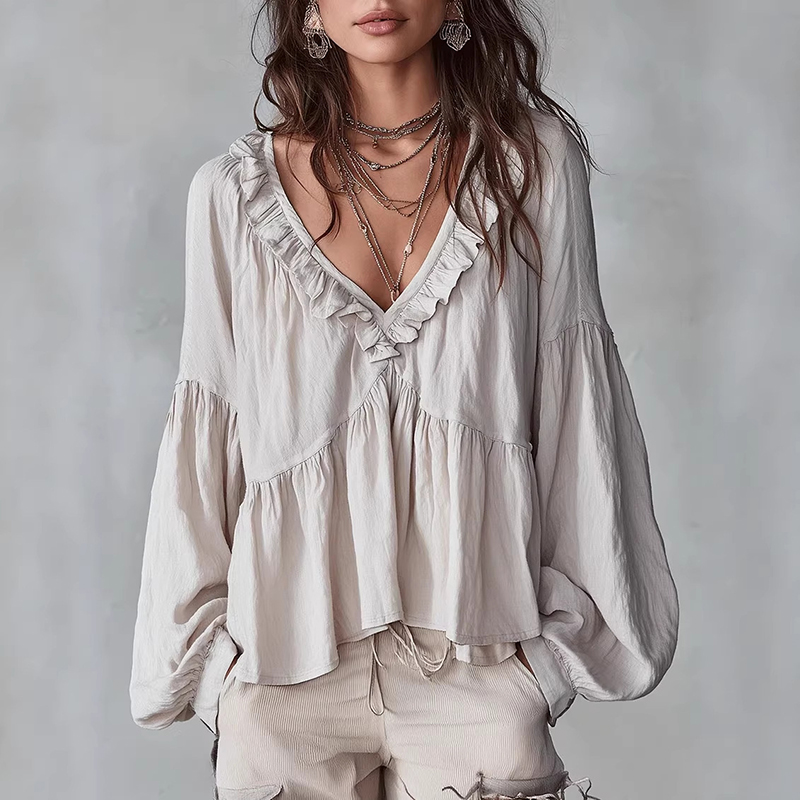Elegant Ruffled Solid Color V-neck Puff Sleeve Shirt$30.99