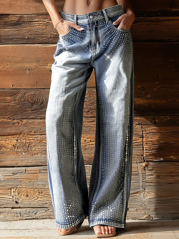 Vintage Bohemian Rhinestone Distressed Washed Denim Jeans$67.99