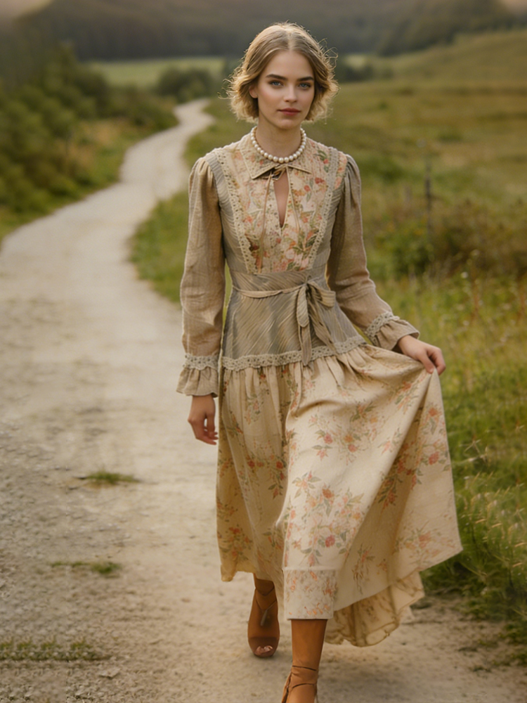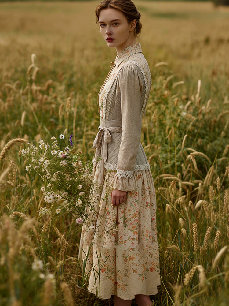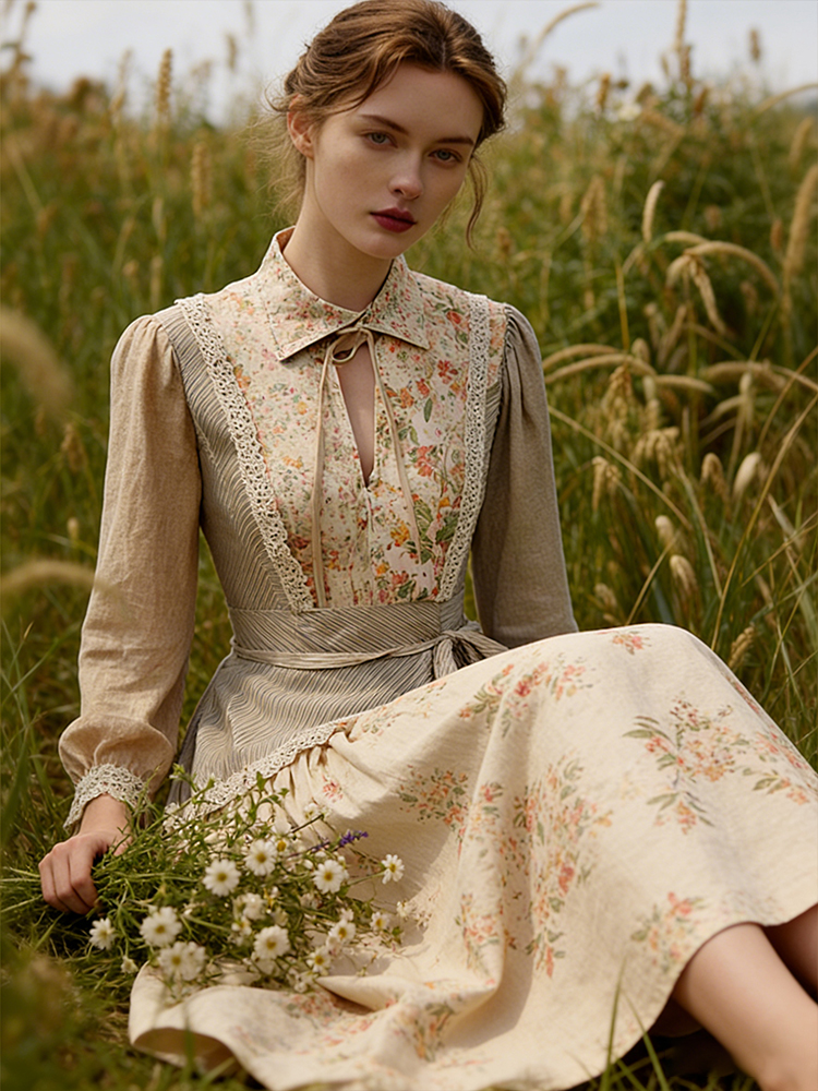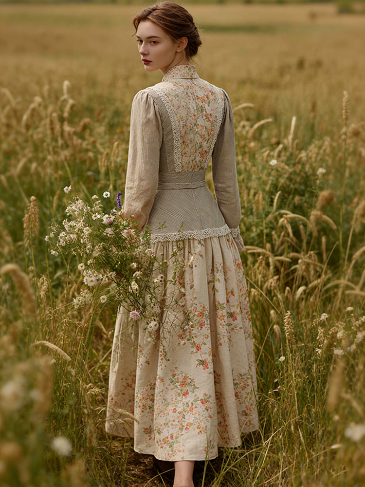 Retro Countryside Style Patchwork Design Linen Dress