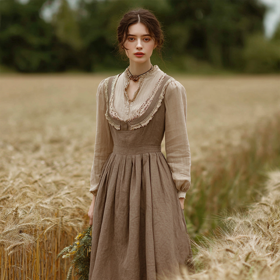 Retro Linen Lace Patchwork French Countryside Style Waist-cinching Dress