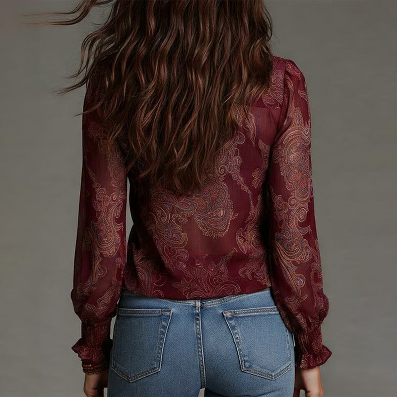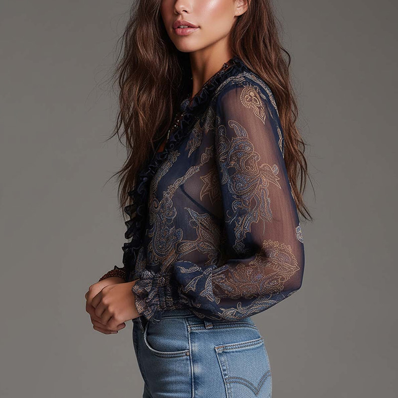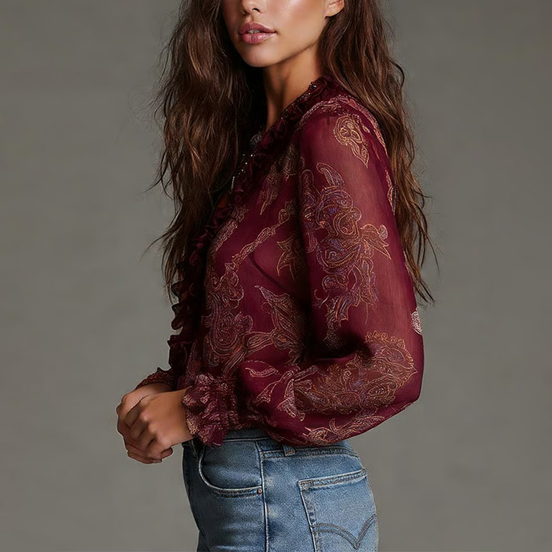 Vintage Baroque Paisley Ruffle Zip Chiffon Blouse