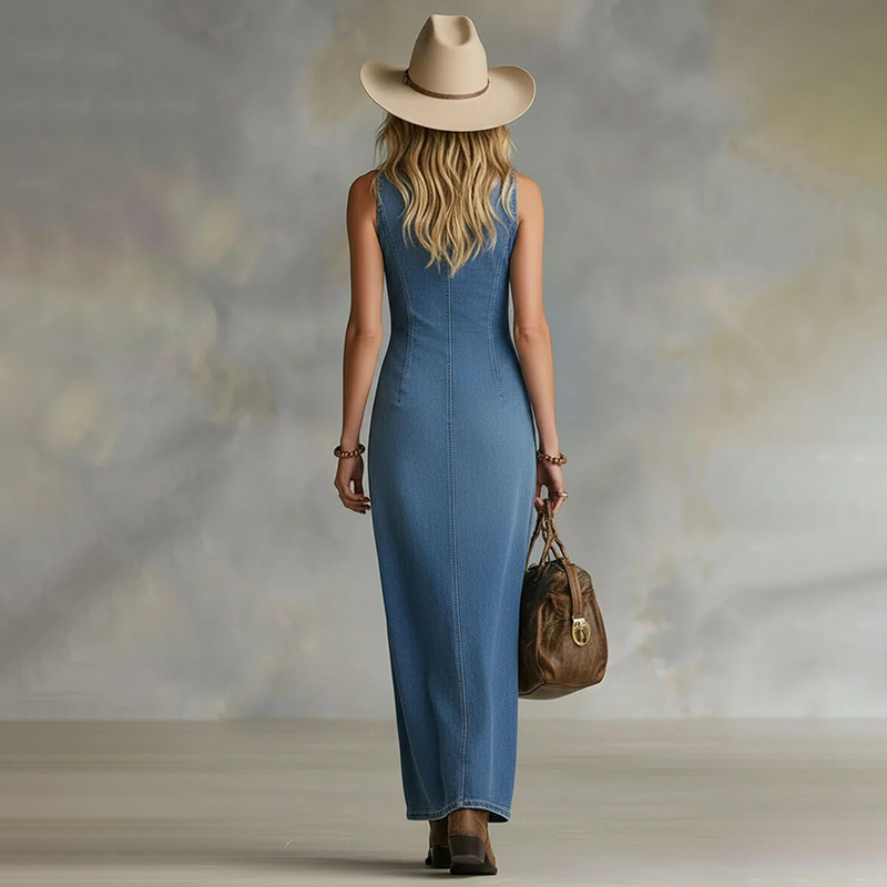 Vintage Button Fly Sleeveless Denim Maxi Dress