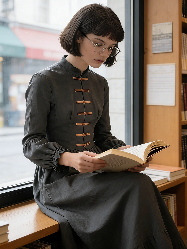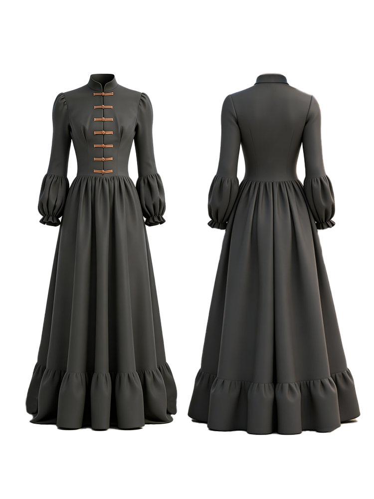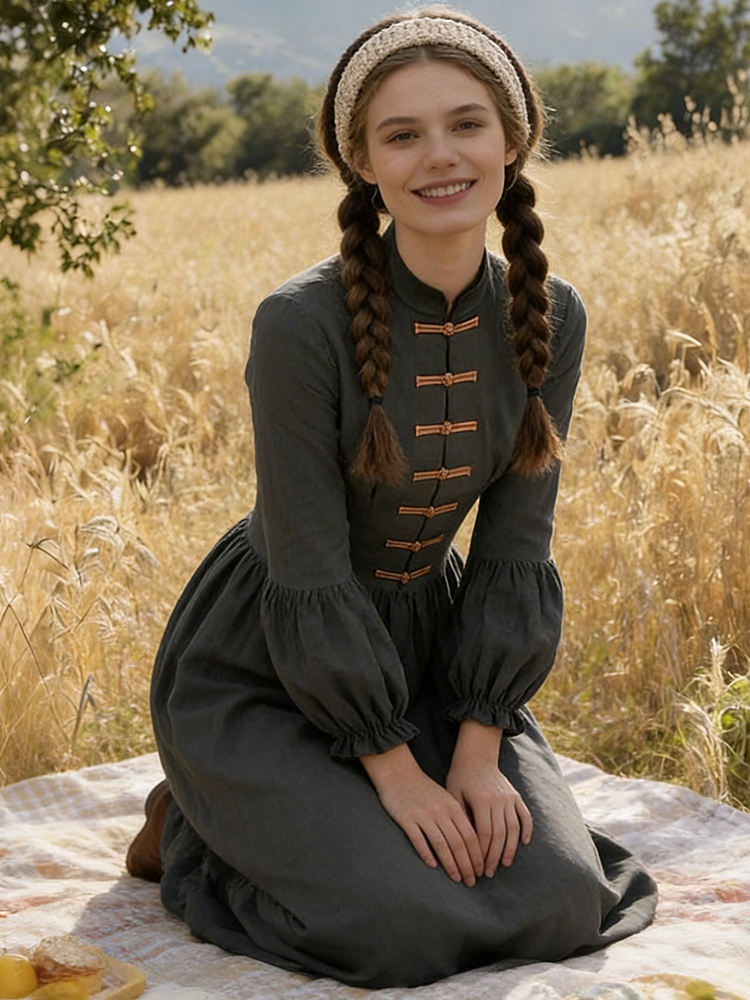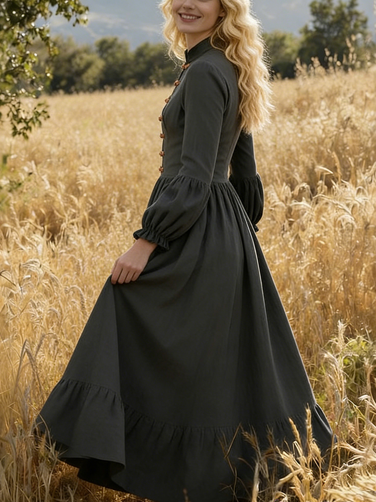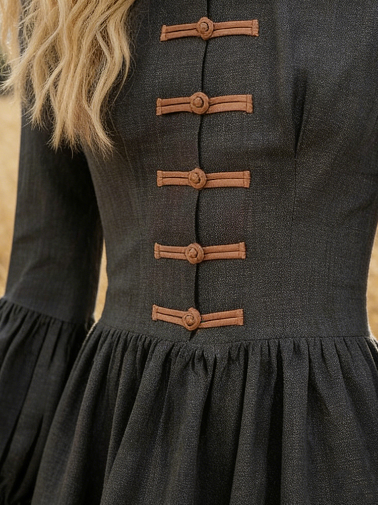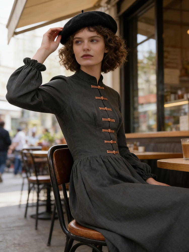 Vintage Elegant Bell Sleeves Pleated Linen Maxi Dress