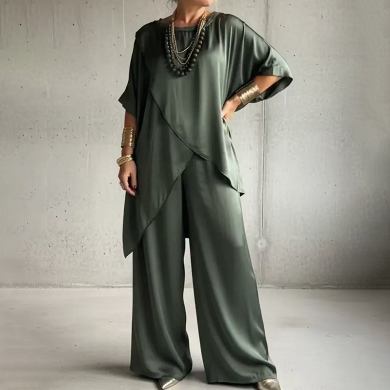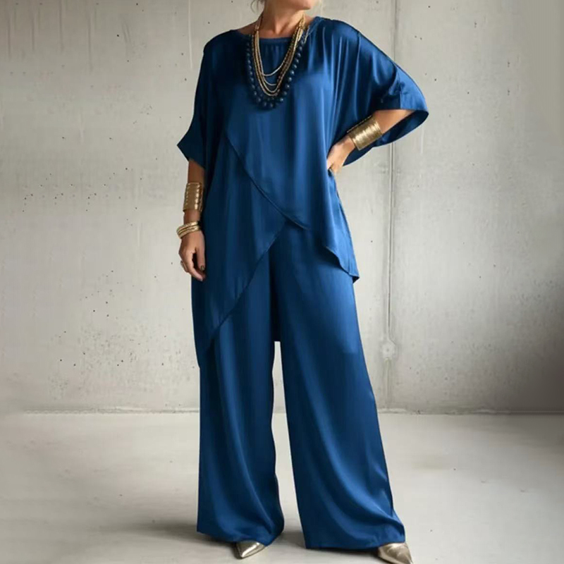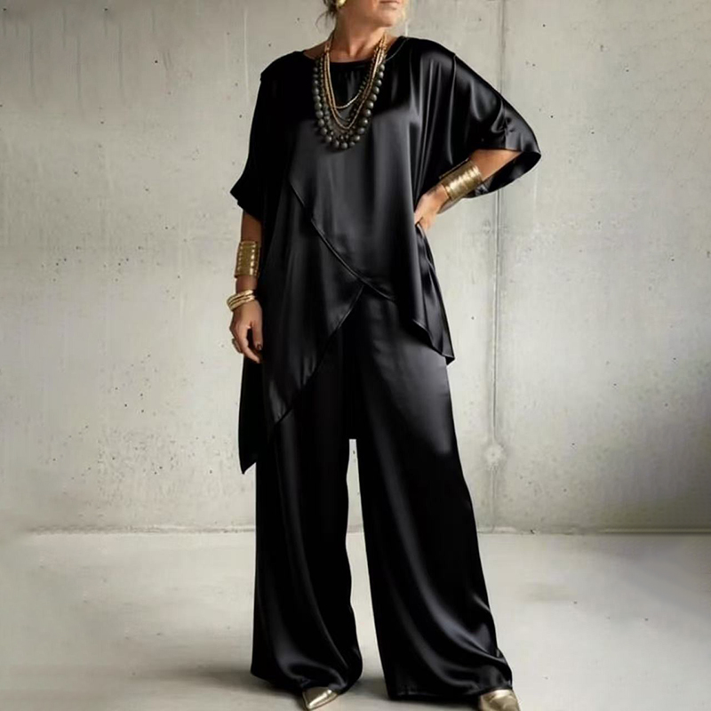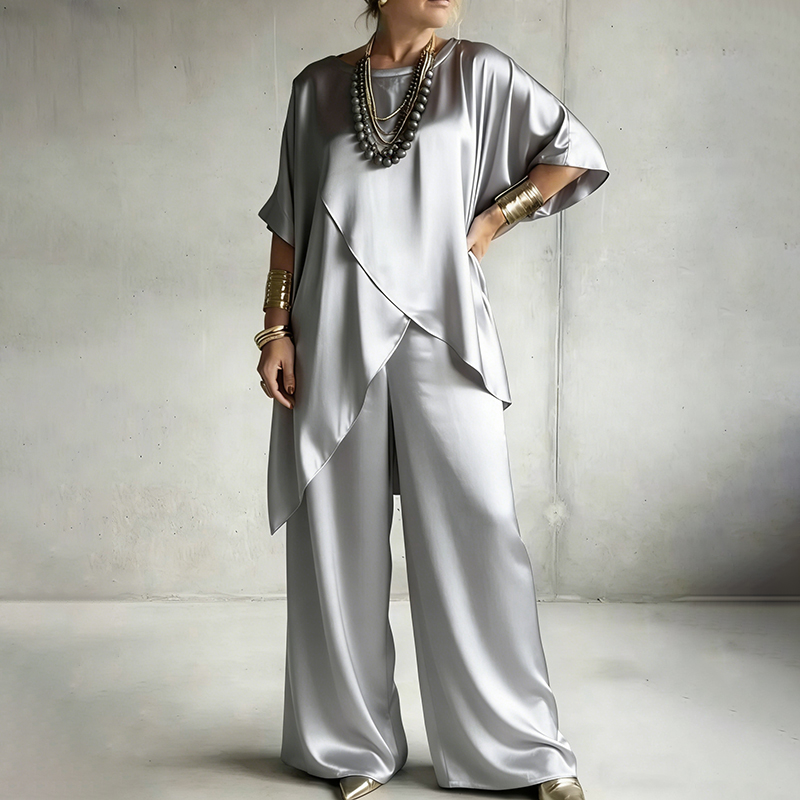 Vintage Elegant Double-layered Satin Top And Pants Two-piece Set