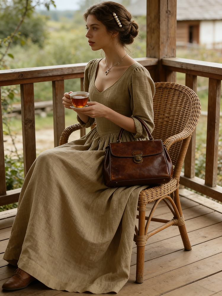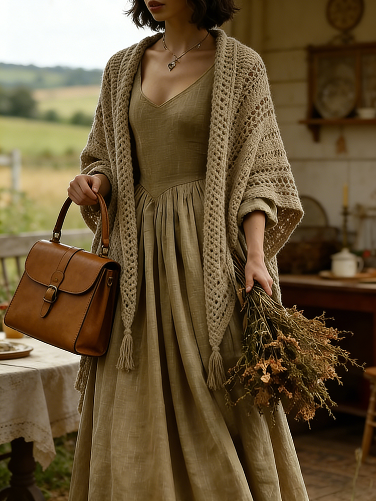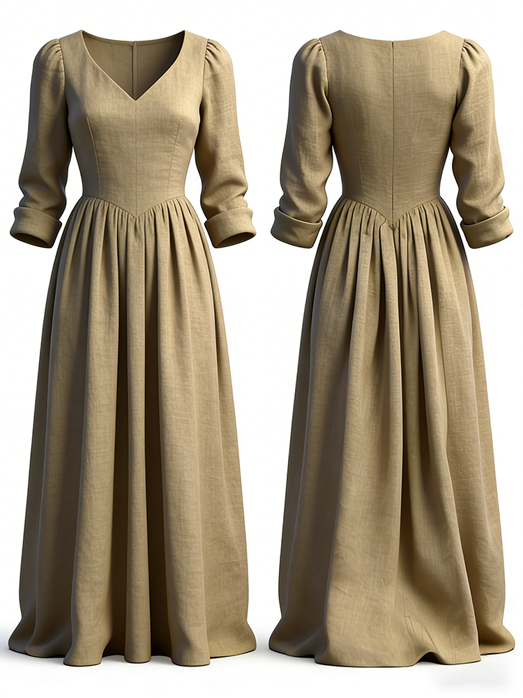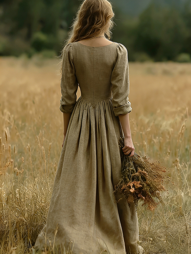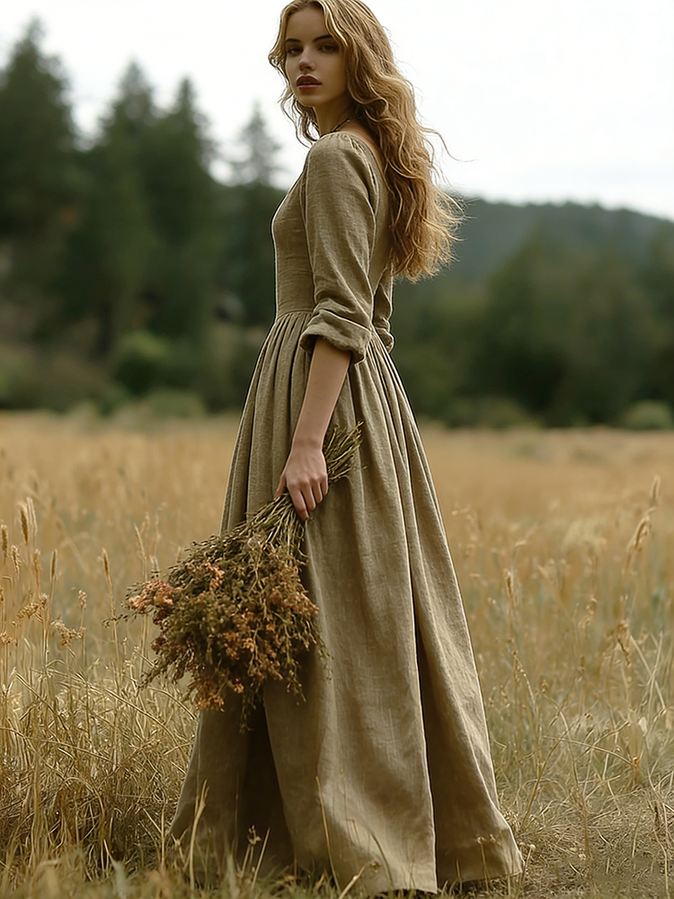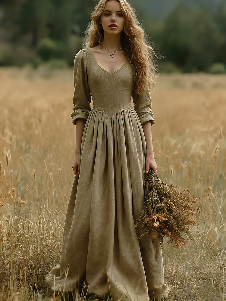 Vintage Elegant V Neck Flowy Linen Maxi Dress