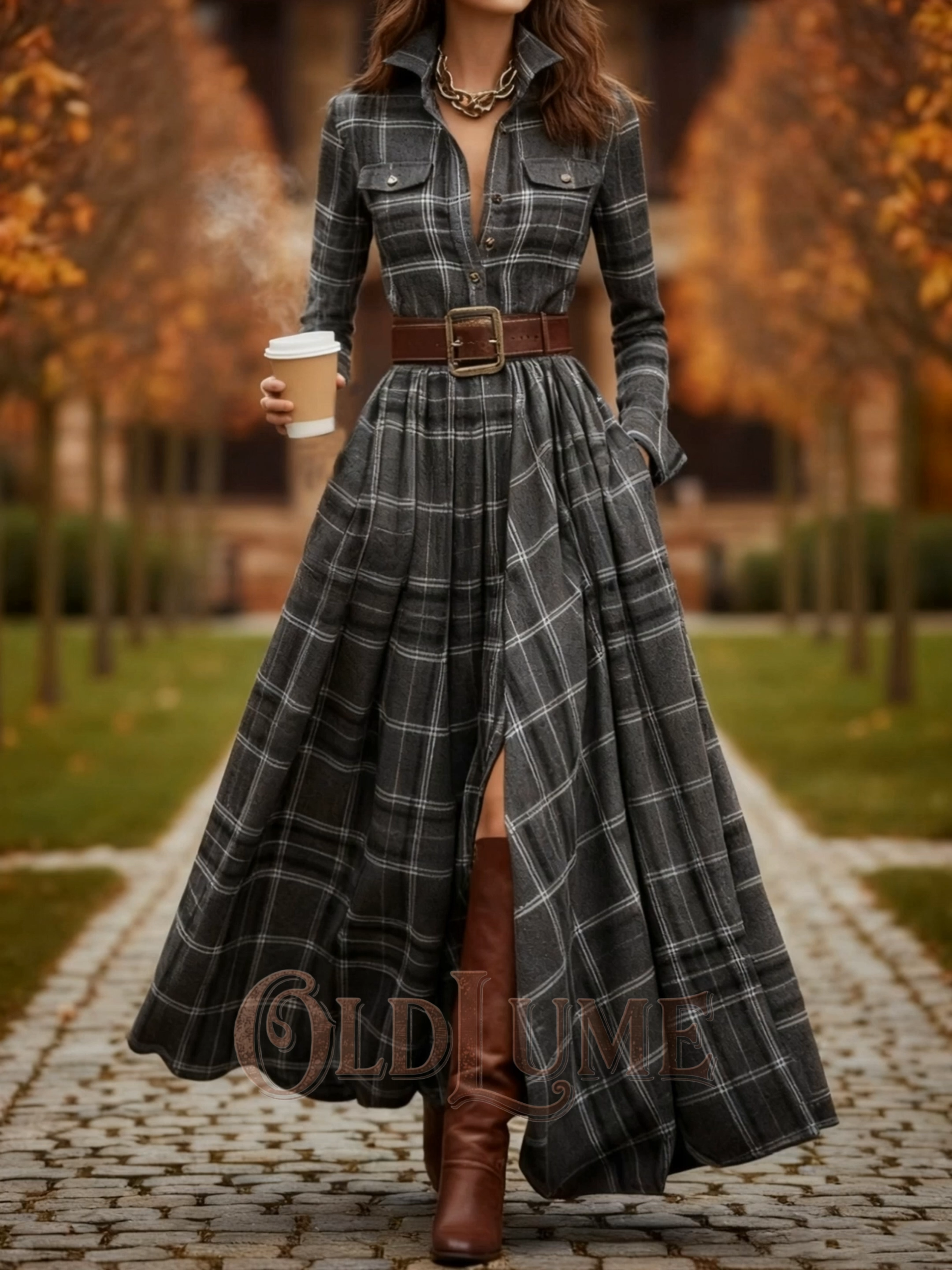 Vintage Khaki Plaid Inspired Belted Cottagecore Autumn Winter Long Sleeve Button-up Shirt Maxi Dress