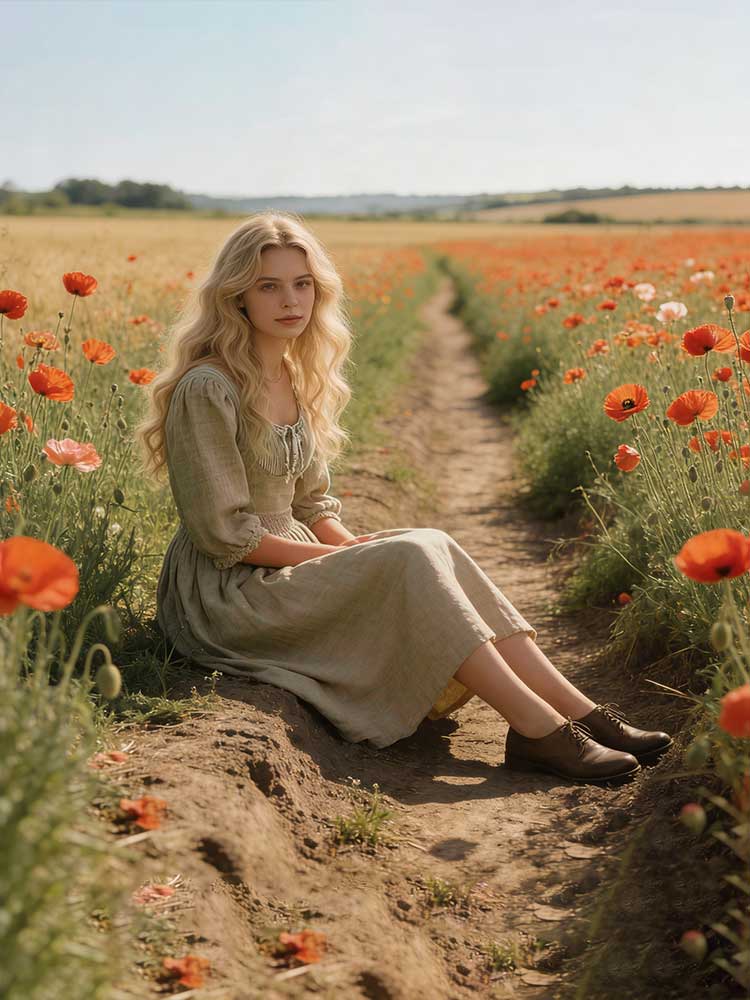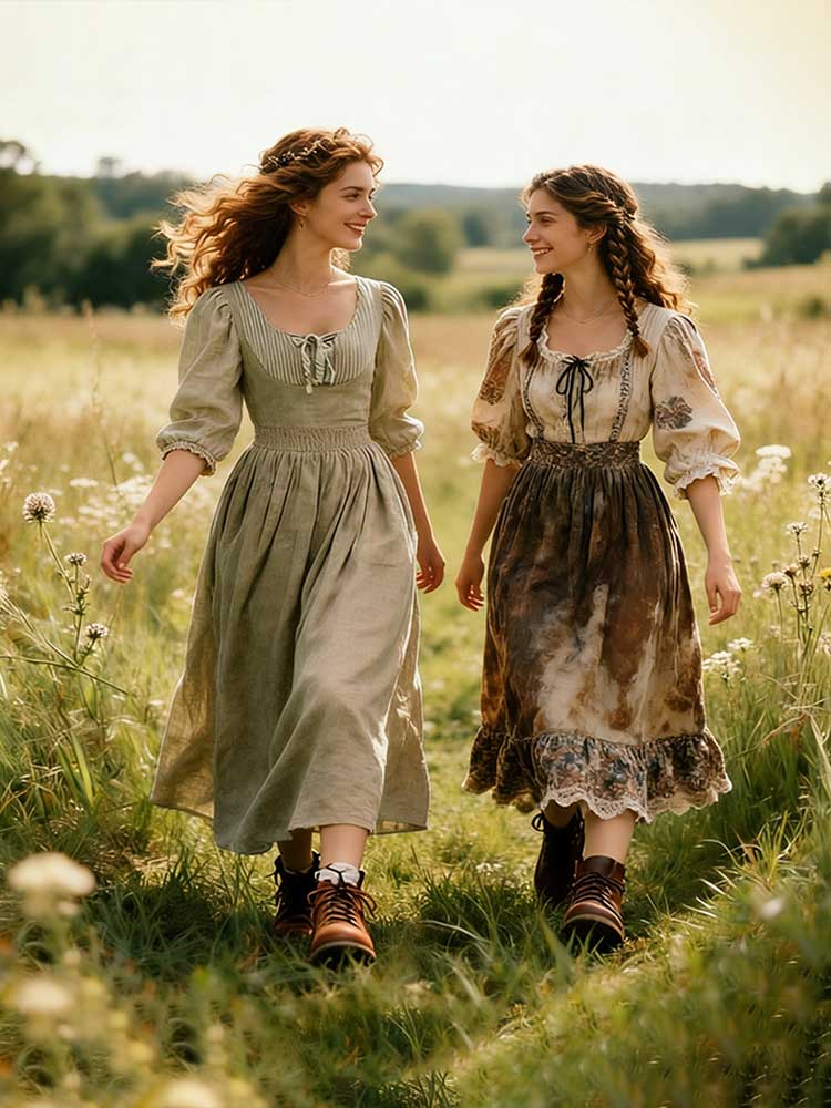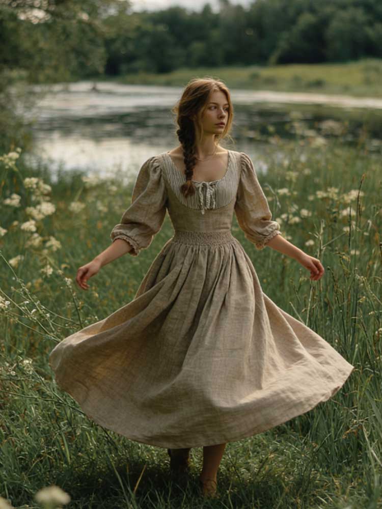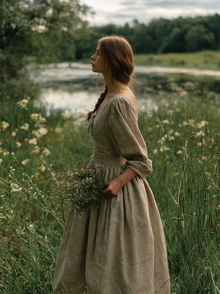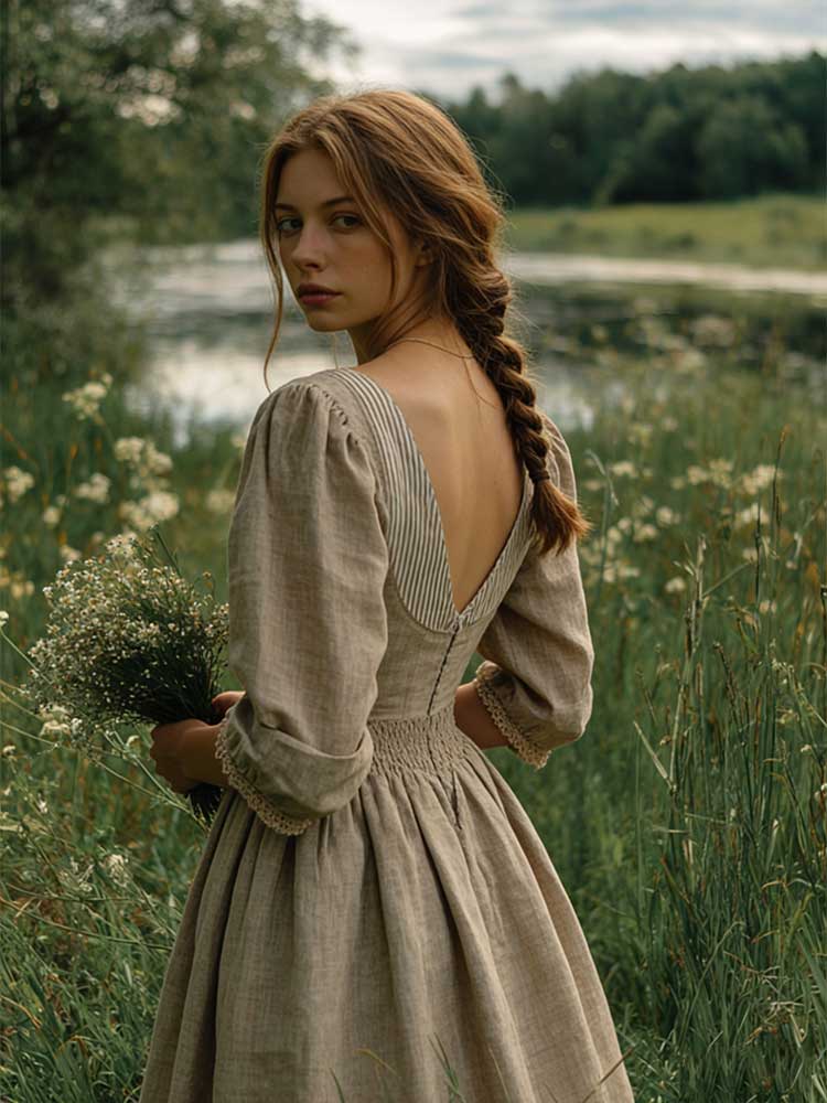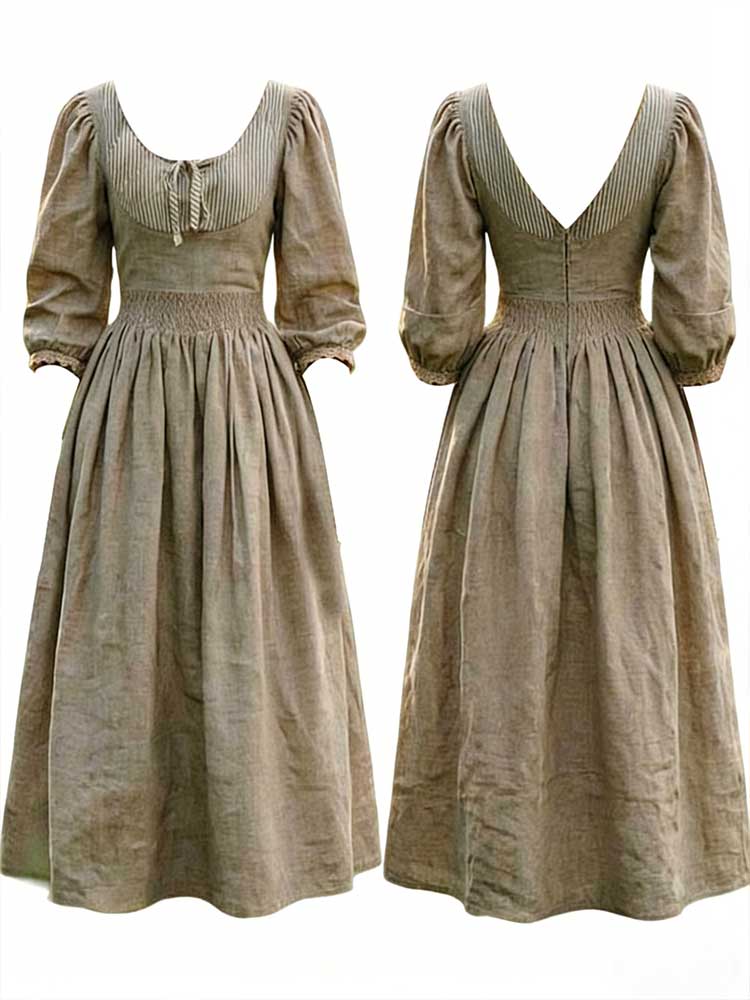 Vintage Patchwork Laced Puff Sleeve Linen Maxi Dress
