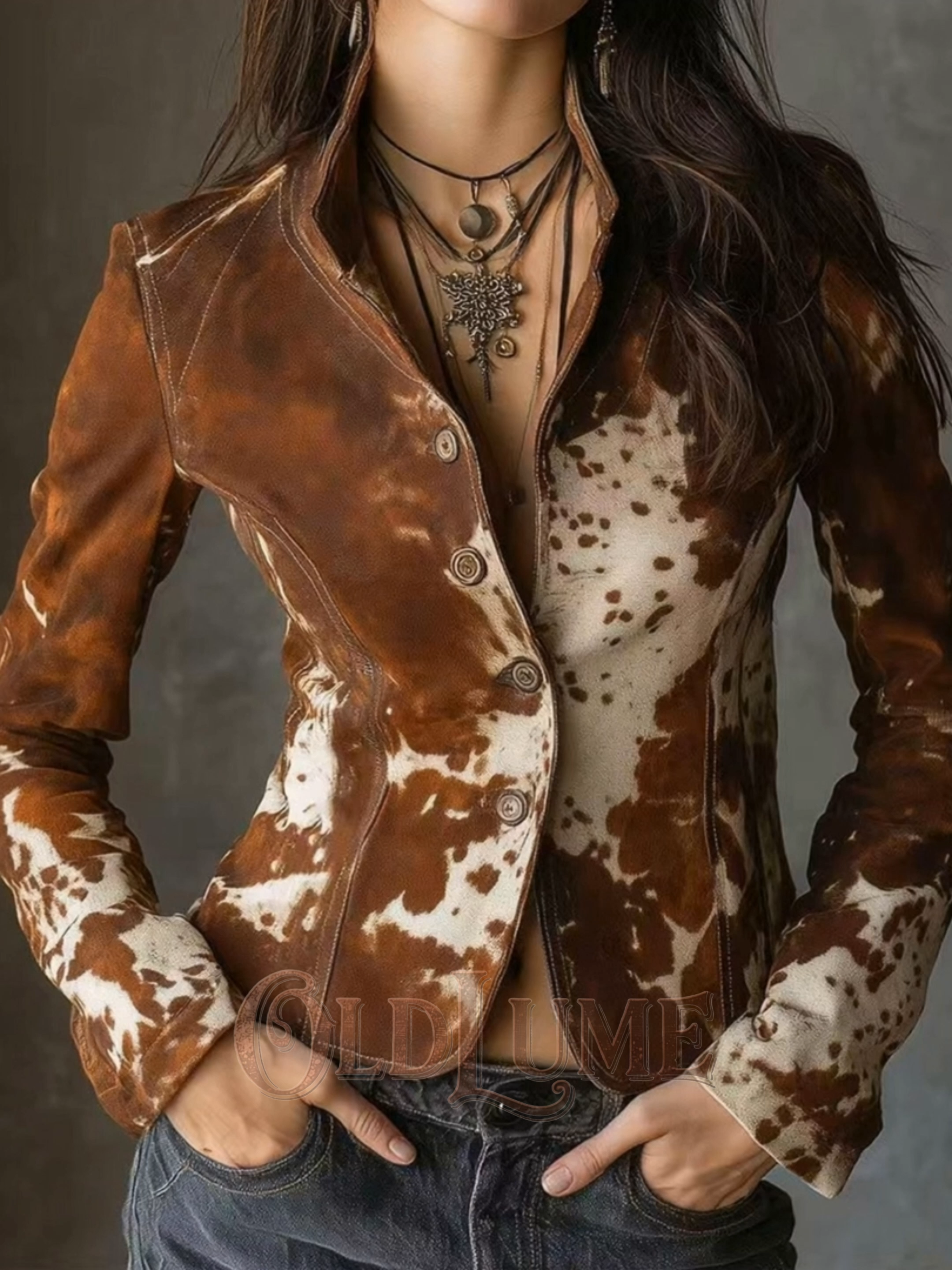 Vintage Stand Collar Suede Cow Print Slim Jacket
