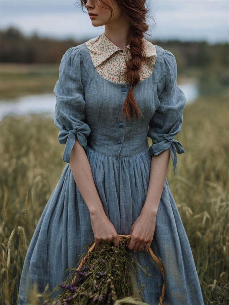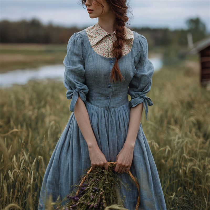 Vintage Tied Puff Sleeve Button Up Linen Maxi Dress